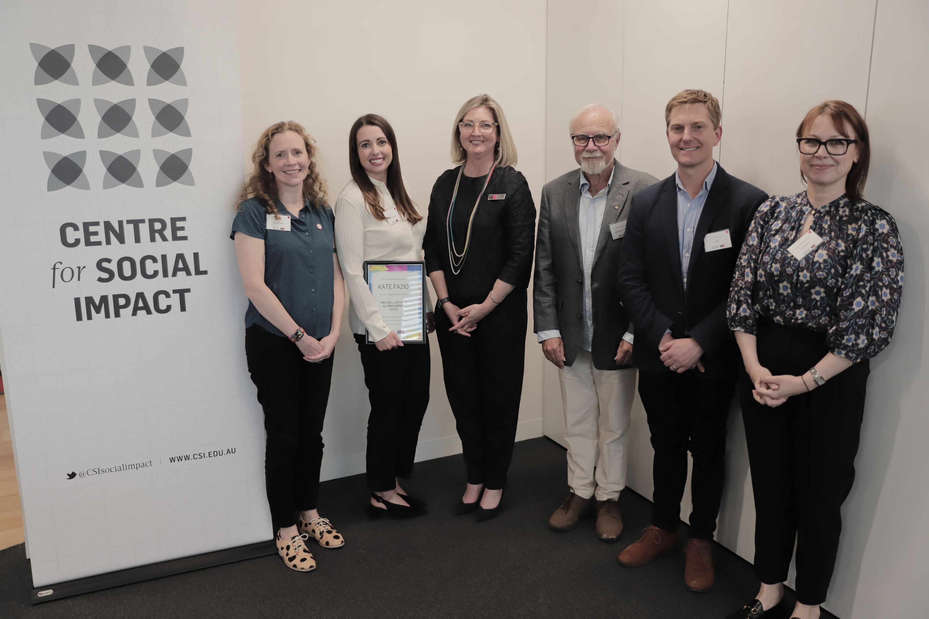 Kirra Johnson, Kate Fazio (winner of the Michael Liffman Alumni Award), Centre for Social Impact Centre Director Libby Ward-Christie, Michael Liffman, Mark Harwood and Amanda Robinson at the inaugural Michael Liffman Alumni Awards.